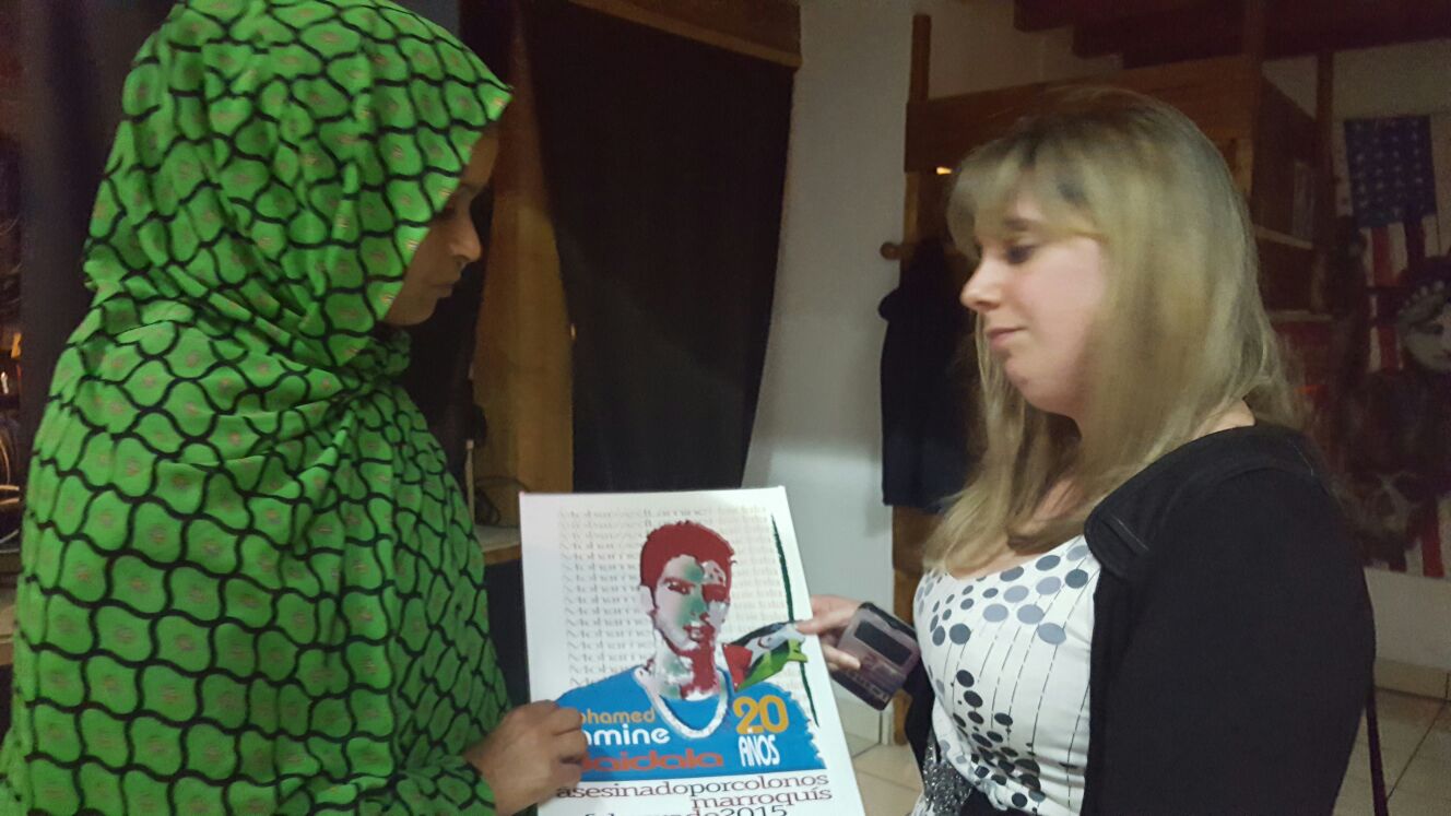 Takbar Haddi en el Centro Social Ítaca arropada por varios activista pro saharauis.