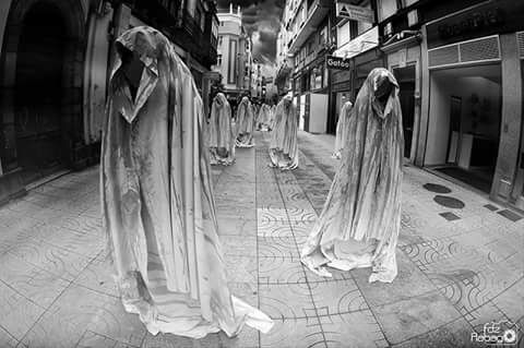 Un poco en la misma línea que otra performance, en el corazón del liderazgo de Europa, en Hamburgo (Alemania), donde, con motivo de la reunión del G-20, hemos podido recuperar en la retina escenas de lucha como las de las ya pasadas de Génova, pero también una acción que mostraba a los seres humanos sin vida, desposeídos hasta de color por culpa de esa conjunción de los hombres de negro y los hombres de negocio, los auténticos fantasmas sin alma.