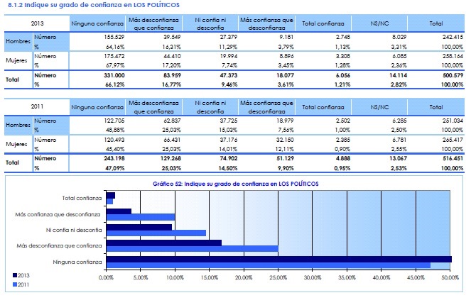 De todos, son ‘Los Políticos’ quienes mayor desconfianza generan, mucha menos que en 2011. Así, el 66,12% afirma no tener ninguna confianza en ellos, pero si sumamos a los que tienen más desconfianza que confianza, el grupo de cántabros se eleva a una gran mayoría del 83%.