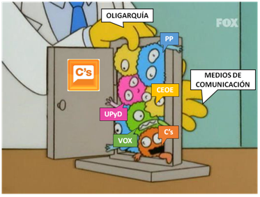 Hace poco vi el capítulo de Los Simpson (joder, qué buena serie) en el que el Sr.Burns tiene tantas enfermedades que, al tratar de atacarle todas a la vez, se bloquean mutuamente, siendo imposible que ninguna le afecte y haciéndole «indestructible». En esta escena vi representados a los camaleones de los que hablo, los cuales ahora cambian su color al naranja para integrarse en Ciudadanos, el partido de moda gracias al aplauso de los medios de comunicación (y al silencio de sus miserias)  y de la oligarquía. Eso sí, a Ciudadanos llegan desde todo tipo de derechas pero tenemos que aceptar que el partido naranja se autodenomine de «centroizquierda».  Y olé. ¡Qué daño ha hecho el discurso «ni de izquierdas ni de derechas»!