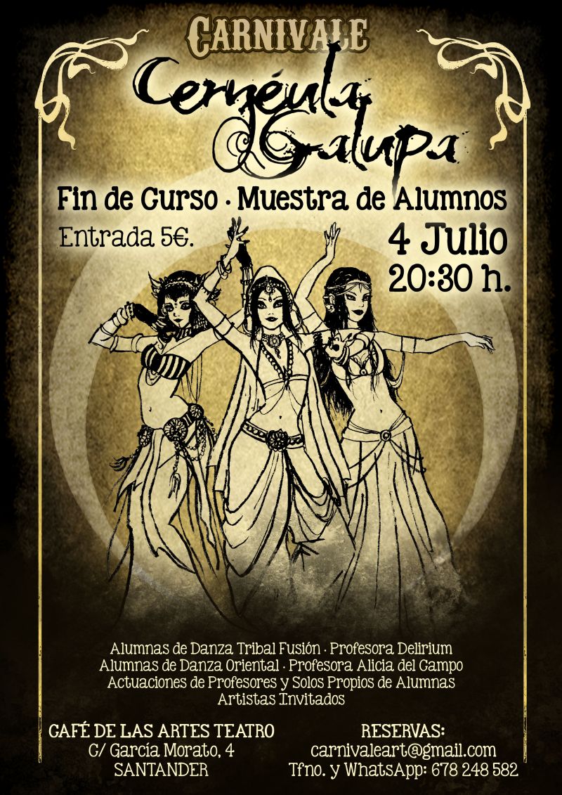 Este sábado, el grupo de alumnos de danza oriental de Alicia del Campo y el de danza tribal fusión de Delirium se juntan para mostrar en una actuación, Cernéula Galupa, las nuevas coreografías que han creado durante el curso en el Café de las Artes a las 20:30 horas.