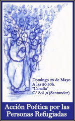 Este Domingo 29 de Mayo, de la mano de Mar Pajarón, estos versos sueltos cobrarán vida en la voz de sus autores mediante una ACCIÓN POÉTICA por LAS PERSONAS REFUGIADAS en el Bar Canalla c/ SOL nº3. (Entrada Libre). Lo recaudado irá destinado a la iniciativa «Baby Hamman/Yellow Tend» de atención directa a los niños y bebes víctimas de esta llamada «crisis de los Refugiados» y gestionado a través de la Plataforma ciudadana «Pasaje Seguro Cantabria con las Personas Refugiadas».
