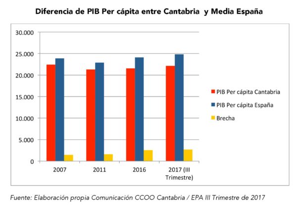 Sánchez está alarmado ante el crecimiento sin freno de la brecha entre el Producto Interior Bruto (PIB) per cápita de los cántabros y el del resto de los españoles. “Entre 2015 y 2017, el PIB per cápita medio de España ha logrado superar el de 2007, Cantabria sigue lejos de conseguirlo”.