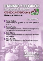 El sábado se cerrará la semana con un último acto sobre feminismo, dentro del programa Ateneo cántabro 2018 organizado por Cantabria No se Vende(CNSV) que en esta ocasión, coincidiendo con la celebración a nivel mundial del Día de la Mujer, nos proponen la mesa redonda “Feminismo y educación: una asignatura pendiente” que se celebrará en el espacio social y cultural L’Asubiu a las 18:30 de la tarde Plazoleta de la calle Marqués de la Hermida (Plaza Dionisio Ridruejo) en Santander.
