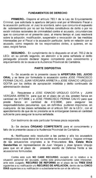 El juez Miguel Ángel Agüero ha dictado auto de apertura de juicio oral al expresidente del Racing, Francisco Pernía, así como a los exresponsables de la cantera, Juan Vergara y José Ignacio Urquijo, por presuntos delitos de apropiación indebida y administración desleal, en el marco de la querella que presentaron los exjugadores del club verdiblanco.