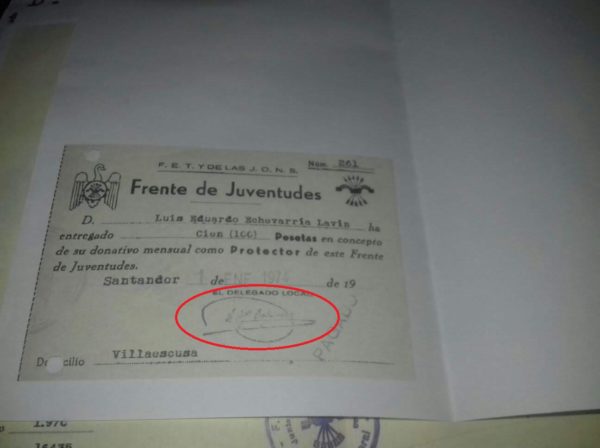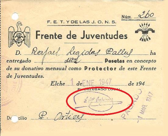 La otra manipulación es respecto a una tercera imagen que se ha difundido por WhatsApp, sobre un donativo mensual de 100 pesetas como «protector» del Frente de Juventudes. En este caso, resulta que la firma del delegado local del Frente de Juventudes es idéntica que la que aparece en un carnet publicado en el apartado de historia de un magazine gastronómico de Elche.