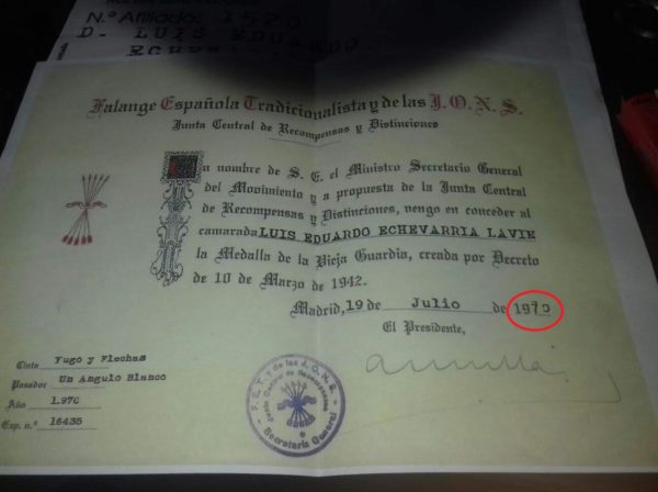 Esta distinción, buscada por coleccionistas de antigüedades militares por su rareza, fue creada en 1942 para reconocer a quienes pudiesen probar su afiliación a la Falange o a la Comunión Tradicionalista antes del 16 de febrero de 1936 (y Echevarría nació el 15 de diciembre de 1952).