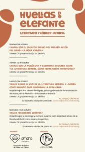 Amara Cantabria (Asociación de madres y padres de niños con cáncer) en colaboración con la Librería Gil continúan con «Huellas de Elefante» , las jornadas orientadas a facilitar la comunicación entre niños y adultos sobre el cáncer infantil. El hilo conductor de las charlas y talleres es la literatura como herramienta terapéutica para gestionar, normalizar y facilitar el diálogo sobre el cáncer infantil y todo su contexto. El lunes comenzarán de nuevo las actividades con el taller sobre el uso de la literatura infantil y juvenil como recurso para favorecer la resiliencia, impartido por Ana Salnero Rodríguez, psicóloga terapeuta de la Asociación Asturiana para la Atención y Cuidado de la Infancia.