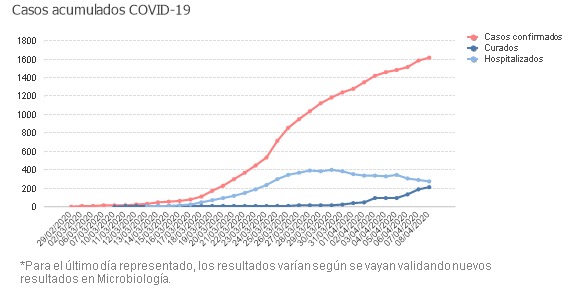 El resumen de las cifras de actualización refleja hoy 1.619 casos computados, 1.307 de ellos activos, sólo 2 más que en la jornada anterior. Además, hay 1.028 personas en aislamiento domiciliario, según los datos proporcionados al Ministerio de Sanidad a las 21:00 horas de ayer.
