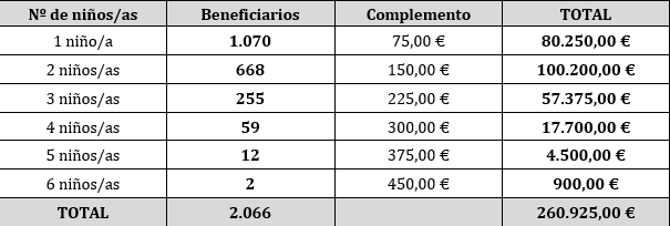 Álvarez ha explicado a los responsables de CEOE, UGT y CCOO que la ayuda, que parte de 75 euros mensuales para una familia con un hijo o hija a cargo, se incrementará progresivamente en función del número de menores en la unidad de convivencia. Así, una familia con dos hijos recibirá un importe adicional de 150 euros; 225 en el caso de una familia con tres menores y 300 euros para familias con cuatro hijos.
