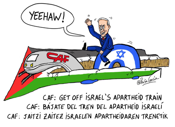 La junta de accionistas de CAF del próximo 13 de junio es una oportunidad para alzar nuestra voz y exigir a la empresa que cese su participación en el proyecto ilegal israelí del Tren Ligero de Jerusalén, proyecto que hace posible que Israel continúe su proyecto de anexión del territorio palestino ocupado.