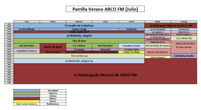 Se mantiene la actualización informativa matinal con ‘El Faradio de la Mañana’ y ‘Carne Cruda’. Chuchi Guerra y Nano Teja continuarán entreteniendo con su ‘A Mediodía, Alegría’, y a las 14.00 horas llegará, como siempre, el tiempo para el deporte con ‘Tiro al Arco’.
