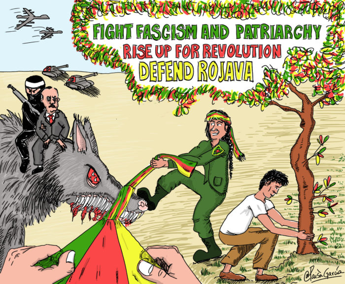 Hace 8 años el pueblo de Rojava organizado derrocó al ISIS en Kobane en Siria, instaurando el Confederalismo Democrático basado en la democracia directa, el ecologismo, el feminismo y el anticolonialismo. Hoy, igual que entonces, la revolución democrática de Rojava se enfrentan a la invasión de su territorio, esta vez a manos del ejercito turco de Erdogan. Debemos defender una solución democrática para Oriente Medio. Debemos defender Rojava.