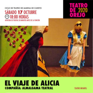 El sábado 17 de octubre tendrá lugar la obra “El viaje de Alicia», también a las 18:00 h. Es una divertida y alocada reinterpretación del clásico cuento de Lewis Carroll, “Alicia en el País de las maravillas”, con una duración de 50 minutos, orientada tanto a niños como a familias.