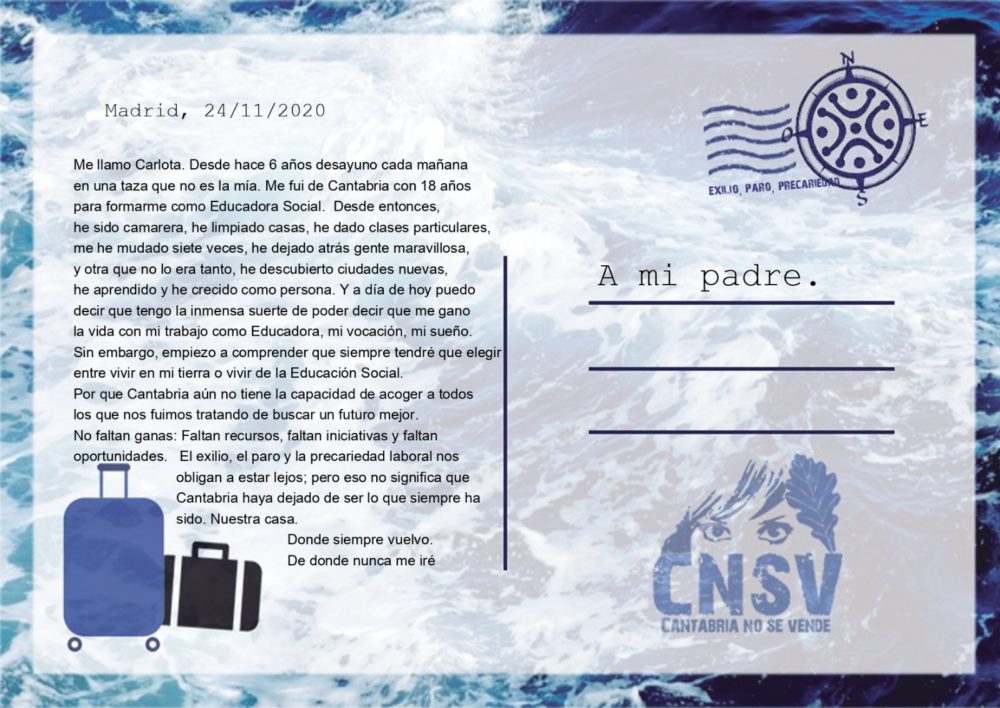 Así, han recogido testimonios como el de Carlota: «Me llamo Carlota, Desde hace 6 años desayuno cada mañana en una taza que no es la mía. Me fui de Cantabria con 18 años para formarme como educadora social. desde entonces he sido camarera, he limpiado casas, he dado clases particulares, me he mudado siete veces, he dejado atrás gente maravillosa y otras que no lo eran tanto, he descubierto ciudades nuevas, he aprendido y he crecido como persona. y a día de hoy puedo decir que me gano la vida con mi trabajo como educadora, mi vocación mi sueño. Si embargo, empiezo a comprender que siempre tendré que elegir entre vivir en mi tierra o vivir de la educación social porque Cantabria aun no tiene capacidad de acoger a todos los que no sufrimos tratando de buscar un futuro mejor. No faltan ganas, faltan recursos, faltan iniciativas y faltan oportunidades. el exilio, el paro y la precariedad laboral nos obligan a estar lejos, pero eso no significa que Cantabria haya dejado de ser lo que siempre ha sido: nuestra casa».