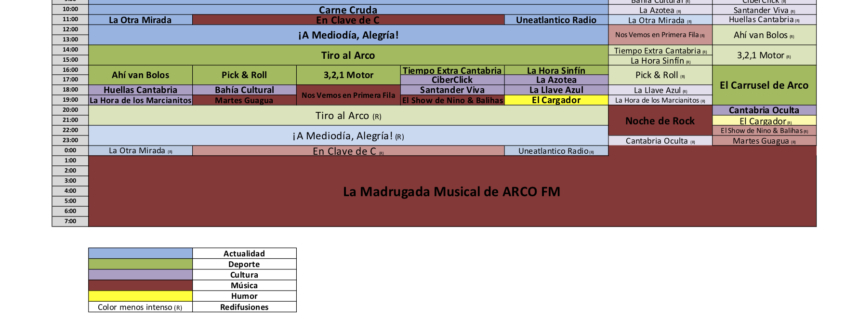 Actualidad, deporte, cultura, música, humor son las principales temáticas que conforman la programación de la joven emisora. ‘El Faradio de la Mañana’, ‘¡A Mediodía, Alegría!’, ‘Carne Cruda’, ‘Tiro al Arco’, ‘Pick & Roll’, ‘3,2,1 Motor’ ‘La Hora de los Marcianitos’, ‘Bahía Cultural’, ‘Santander Viva’, ‘Noche de Rock’, ‘Cantabria Oculta’, ‘Nos Vemos en Primera Fila’ o ‘El Show de Nino & Balihas’ son algunas de las cabeceras más destacables de ARCO FM, pero no las únicas.