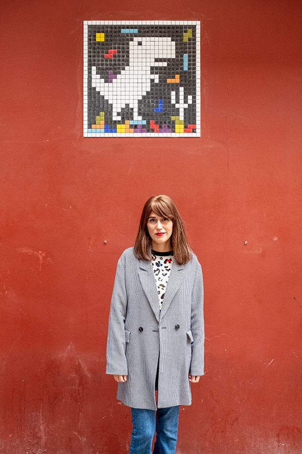 “Extinción 2.0” es el título de la intervención de la ilustradora Lucía Ezquerra. Una obra convertida en un chiste gráfico protagonizada por el famoso T-Rex que aparece cuando no hay conexión a internet bajo una lluvia de meteoritos de fichas de Tetris. “He querido aprovechar la retícula de las teselas a modo de píxeles para recrear ese mundo-videojuego”, explica la diseñadora gráfica, quien se ha mostrado sorprendida por las posibilidades del servicio de personalización de Hisbalit. “Me ha permitido jugar con diferentes gamas de colores y texturas, plasmando mi idea en mosaico”, añade.