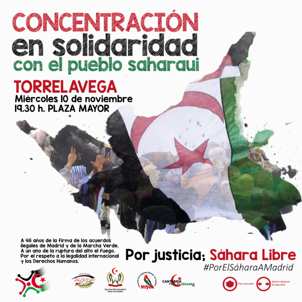 Los colectivos comprometidos con la causa, Cantabria por el Sáhara –miembro de la Coordinadora Cántabra de ONGDs–, Alouda Cantabria, Comunidad Saharaui Miyek y la Delegación del Frente Polisario, animan a participar en la Concentración del día 10 de noviembre en Torrelavega, como acción previa a la Manifestación estatal que se desarrollará en Madrid el sábado 13 de noviembre.
