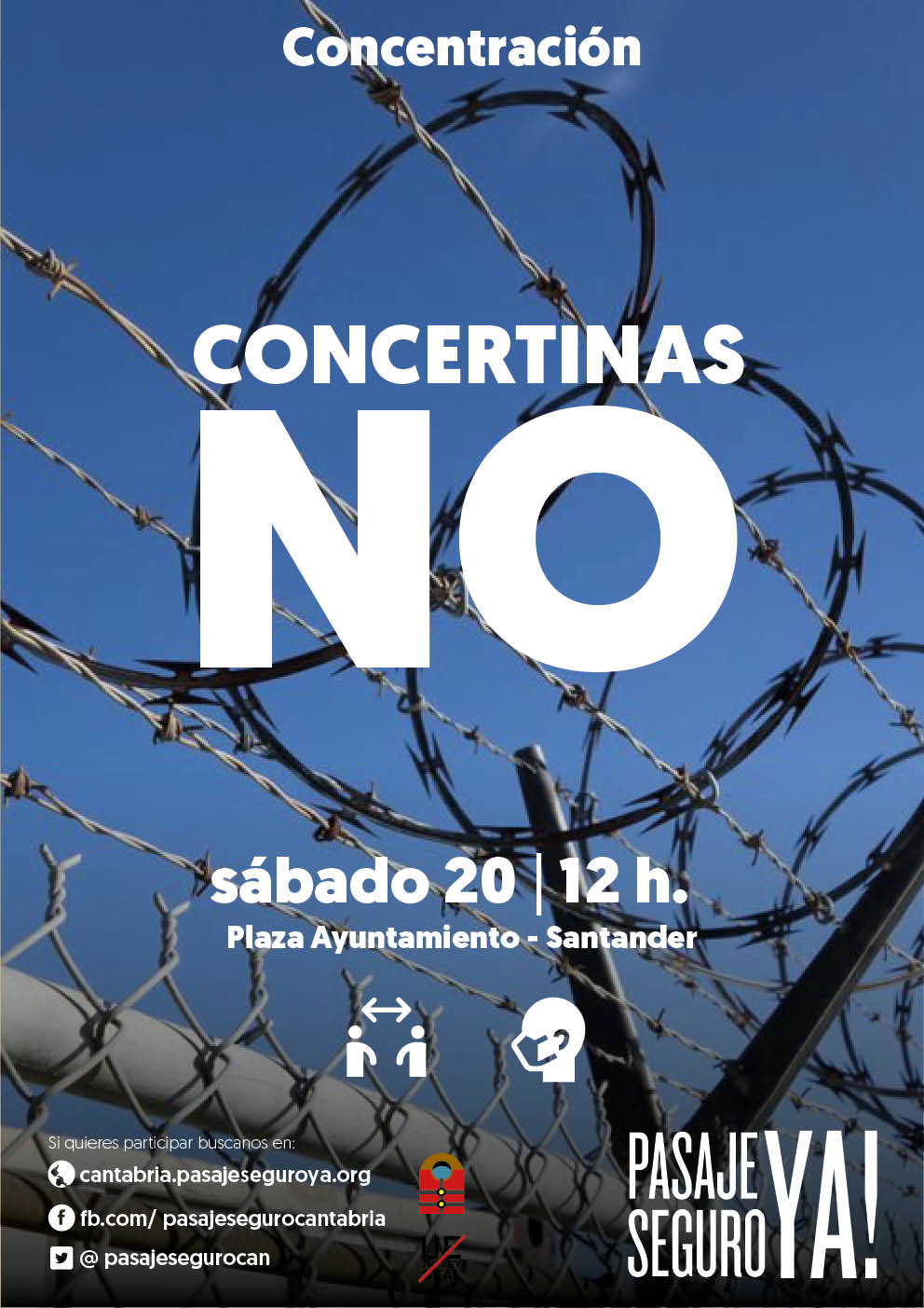 Desde Pasaje Seguro no estamos dispuestos a aceptar una agresión a los Derechos Humanos de esta importancia. Estamos seguras que muchas más personas en la región tampoco lo están. Entre otras cosas, porque el ataque contra personas más vulnerables es siempre el preludio del que se produce contra quienes todavía mantenemos derechos de ciudadanía que a otras personas se les niegan. Por esa razón hemos denunciado ante el Defensor del Pueblo la instalación de las concertinas. Por esa razón estamos recogiendo firmas digitalmente contra esta medida Por esa razón nos concentraremos el sábado 20 de noviembre a las 12 de la mañana en la Plaza del Ayuntamiento de Santander.
