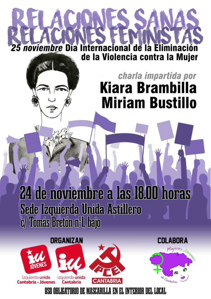 La red juvenil de Izquierda Unida en Cantabria, junto a IU y el PCE, ha previsto la charla-coloquio ‘Relaciones sanas, relaciones feministas’ para este miércoles, víspera del 25N, Día Internacional de la Eliminación de la Violencia contra las Mujeres.