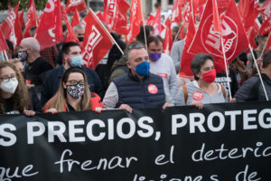 Los sindicatos UGT y CCOO, las asociaciones de trabajadores autónomos UTAC y UATAE, la Federación Cántabra de Asociaciones de Vecinos (FECAV) y la Federación de Consumidores FACUA exigieron este miércoles, en una concentración en Santander, medidas urgentes y contundentes para el control de los precios y para la protección del empleo con ayudas específicas para sectores productivos «muy dependientes del consumo energético que lo están pasando especialmente mal».