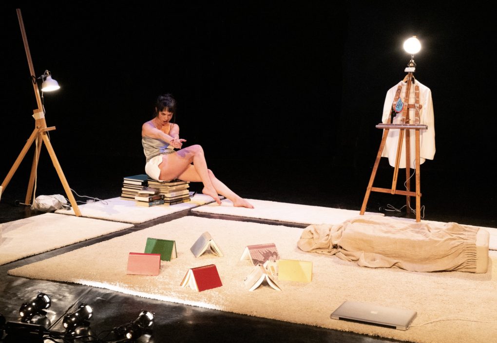 La propuesta de M.A.R.I.L.U.L.A. se basa en un ejercicio de metonimia tanto a nivel escénico como interpretativo. Nos encontramos ante un espacio que se concibe solo a través de una alfombra, algunos libros y un ordenador portátil. Este es el espacio de la casa de Lula. Ella es artista, es una ciudadana como todas nosotras. Tiene trabajo, tiene amigos, folla, sale a pasear, se toma sus vinos. Y se ríe. Y se lo pasa bien.