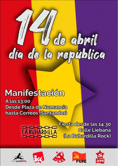 Una manifestación que partirá desde la Plaza de Numancia de Santander hasta el edificio de Correos será el acto principal de la conmemoración del 91 aniversario de la proclamación de la II República en Cantabria. Las organizaciones convocantes harán este recorrido a las 13.00 horas del jueves, 14 de abril, seguido de una fiesta que tendrá lugar a partir de las 14.30 en La Buhardilla Rock, en la calle Liébana.