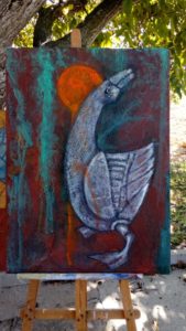 «Pensé que tenía que dejar de dispersarme y centrar mi creatividad en un tema, así que sólo me comunico a través de pájaros, lo que no significa que sea naif. Pinto pájaros inventados imaginarios, en todos los soportes, técnicas y fases. Muchas veces son pájaros muy humanizados, hay una serie en la que están vestidos incluso y no vuelan», cuenta para EL FARADIO este peculiar artista que hace tiempo dejó de firmar sus cuadros, al menos en la parte frontal.