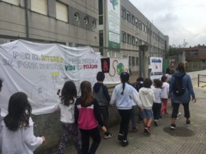Allí estaba convocada una concentración a las once y cuarto coincidiendo con la hora del recreo del centro, para protestar por las obras de construcción de una gasolinera a tan solo unos metros del instituto. «Nos parece importante mostrar nuestra oposición a esta obra junto al instituto donde vendrán nuestros niños de primaria cuando terminen el sexto curso. Los niños han venido con nosotros porque uno de los principios de nuestra educación es ejercer los derechos de la ciudadanía en una sociedad democrática. Si pudiera elegir un entorno ideal, me gustaría que los alumnos tuvieran espacios verdes y no una gasolinera al lado de la ventana de clase. Es una cuestión de seguridad y también medioambiental», explicaba para El Faradio Rosa, una profesora del Eloy Villanueva.