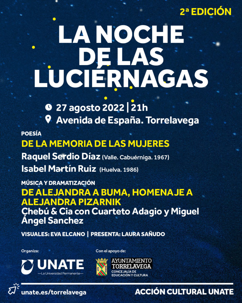 Otra cita de UNATE en Torrelavega será este sábado, la segunda edición de “La Noche de las Luciérnagas, una acción cultural, que supone la clausura de la programación especial de verano y arranque del Curso 2022-2023 de la Sede de UNATE en Torrelavega, y que, en esta ocasión, está consagrado a la voz creativa de las mujeres.
