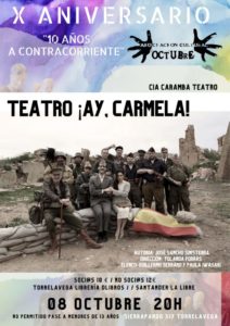 La asociación Cultural Octubre ha programado para este sábado con motivo de su décimo aniversario, la representación de ¡Ay, Carmela! una producción de Paula Iwasaki y Guillermo Serrano, fundadores de Caramba Teatro.