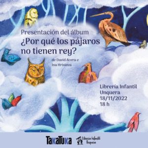El narrador oral y escritor David Acera ha publicado este mes de noviembre ¿Por qué los pájaros no tienen rey?, el nuevo libro del autor asturiano dirigido al público infantil. Editado por la editorial barcelonesa Takatuka en castellano y catalán, se trata de un colorido álbum ilustrado por la artista búlgara Ina Hristova donde David Acera recrea con una mirada literaria contemporánea una de las fábulas más desconocidas y sorprendentes del autor de la antigua Grecia Esopo, La corneja y los pájaros, protagonizada por un ave diminuta de nombre majestuoso: el reyezuelo.