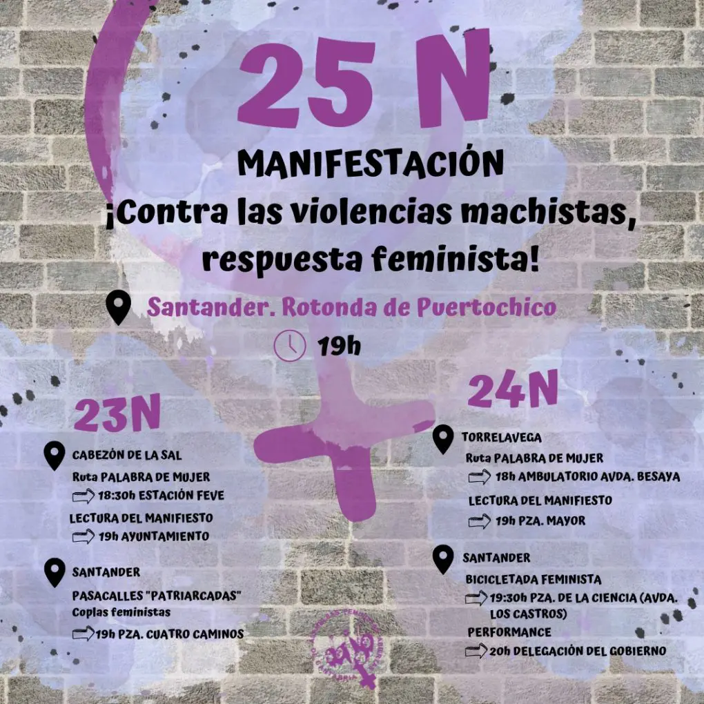 Señalan además que la respuesta ante estas violencias debe ser rotunda y unánime y, por ello, este año la manifestación, prevista para el viernes 25 de noviembre a las 19:00 horas en Santander, ha sido convocada de forma conjunta conla Comisión 8 de Marzo de Cantabria y las Percumozas.