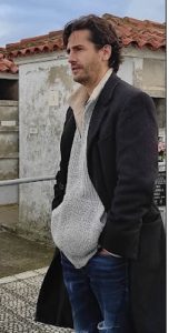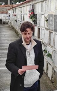 Daniel Grao ante la tumba de Rapún, el amante de Lorca al que interpreta en La piedra oscura, enterrado en Ciriego