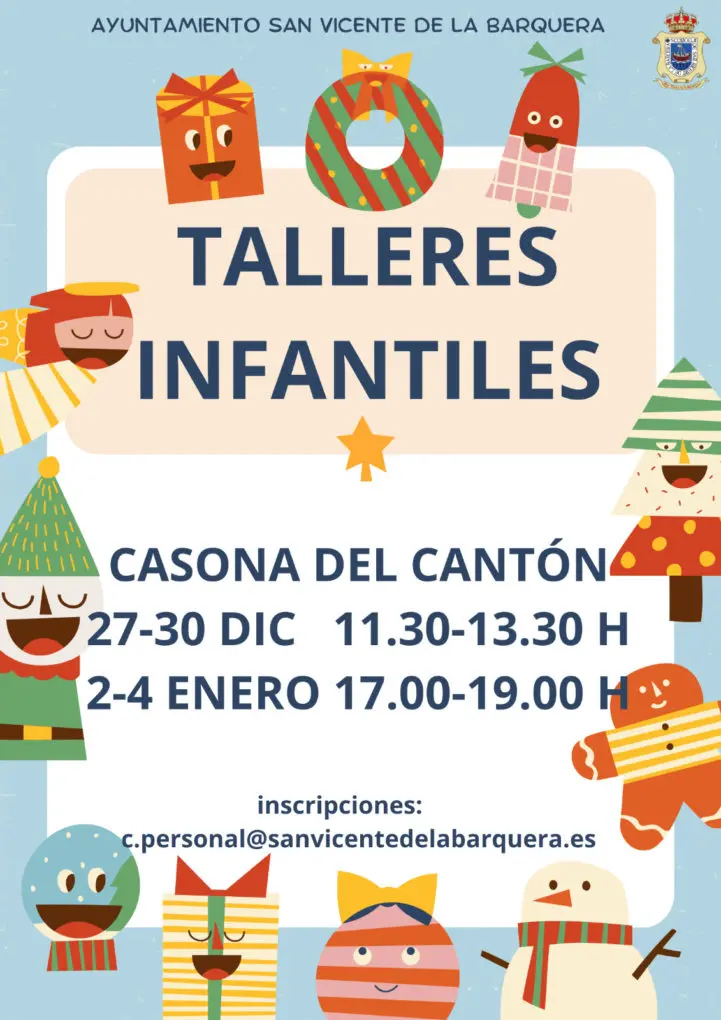 Los Talleres Infantiles son en la Casona del Cantón del 27 al 30 de diciembre de 11.30 a 13.30 horas, y del 2 al 4 de enero de 17.00 a 19.00 horas.