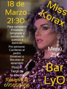 Para el 18 de marzo, el LYO presenta una original propuesta a base de cena y espectáculo con Miss Korax. Por 25 euros ofrecen un menú con ensalada templada y surtido de quesos ibéricos, carrilleras al Pedro Ximenez o bacalao ajoarriero y de postre, tarta de la abuela.