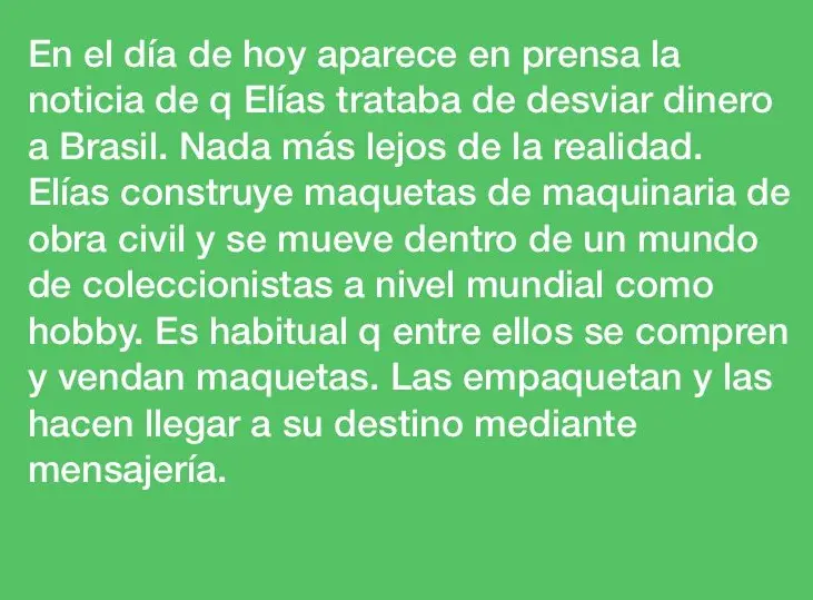 Según explica, lo que sucede es que su hermano construye maquetas de maquinaria de obra civil y se mueve dentro de un mundo de coleccionistas a nivel mundial como hobby, en el que “es habitual que entre ellos se compren y vendan maquetas” que “empaquetan y las hacen llegar a su destino mediante mensajería»,