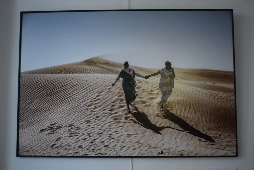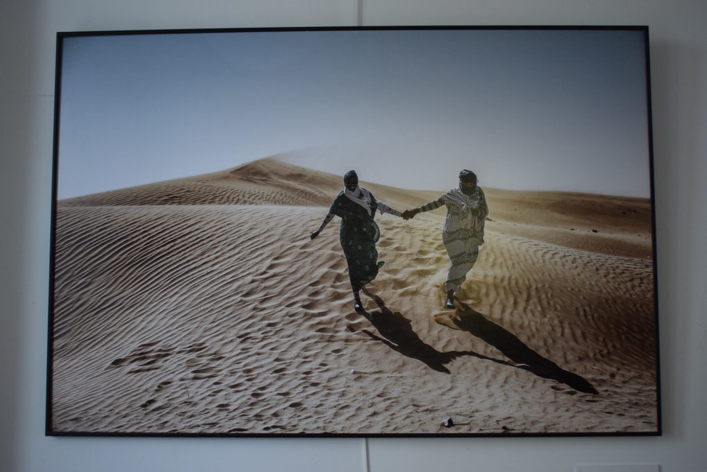 Este viaje de la mano de las imágenes de Nuria González nos acerca a mujeres como María o Dima, disfrutando del tiempo libre en las dunas de la wilaya de Dajla o al joven Ehmuda, que utiliza una melfa, el vestido de la mujer saharaui, como una vela de windsurf para simbolizar y denunciar el expolio en recursos naturales en el Sáhara Occidental.