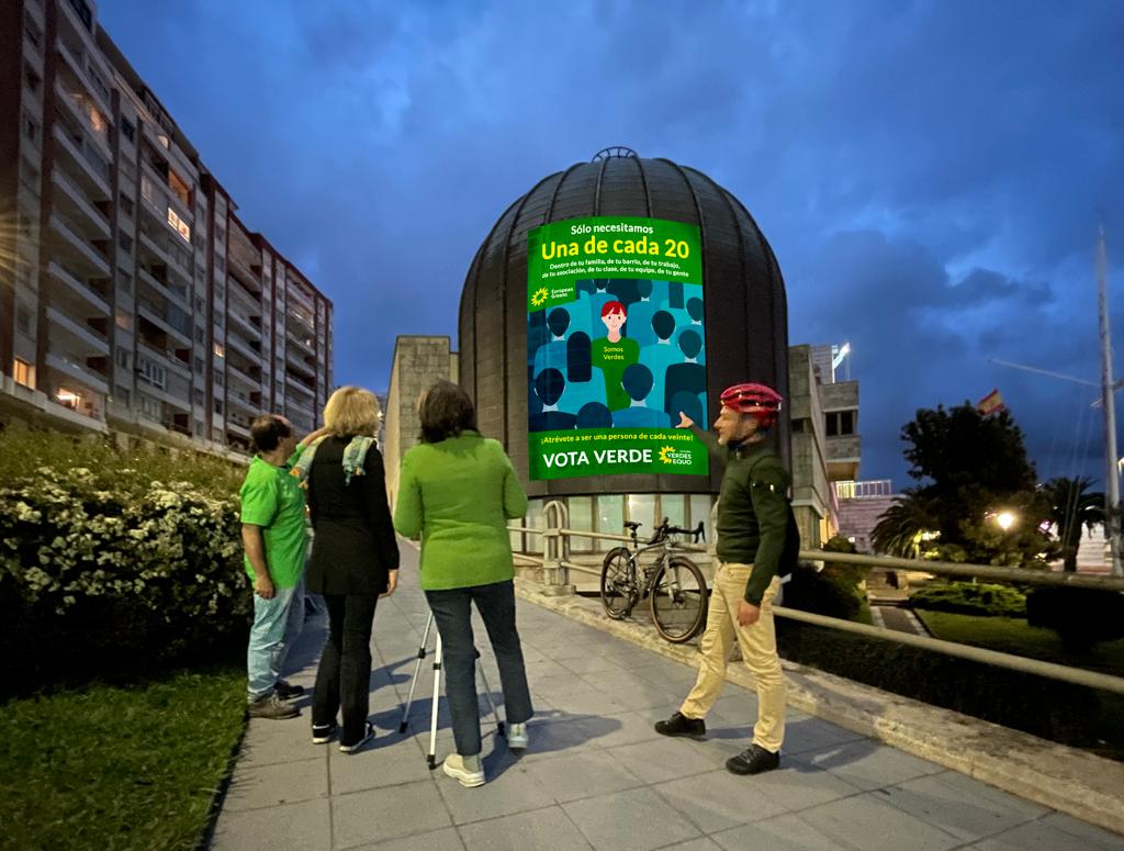 Verdes Equo Cantabria mostraba en su arranque de campaña la parte más sostenible de su campaña: no pegaron carteles, sino que los proyectaron sobre la sede de la Escuela de Náutica, y también acudieron al Parlamento, trasladando además que compensarán con una plantación de árboles la huella de carbono que genera una campaña electoral que ,por lo demás, entre carteles, viajes y movimiento de bits, no es lo más sostenible ni pro-decrecimiento del mundo.