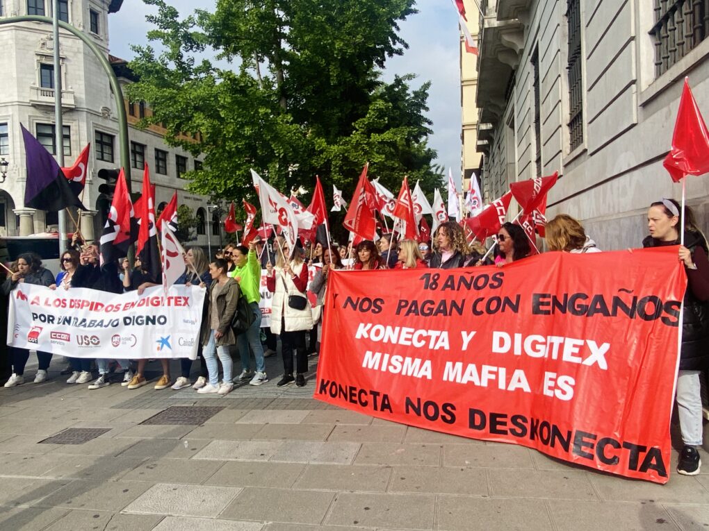 La plantilla de Digitex de la planta de Maliaño se ha movilizado de nuevo contra el traslado de la actividad a centros de Barcelona y Jaén que ha iniciado la empresa, que pertenece al grupo Konecta. En esta ocasión, se han concentrado frente a la Delegación del Gobierno en Cantabria coincidiendo con el paro de 9.00 a 11.30 horas al que estaban llamadas las 159 trabajadoras de Digitex en Cantabria.