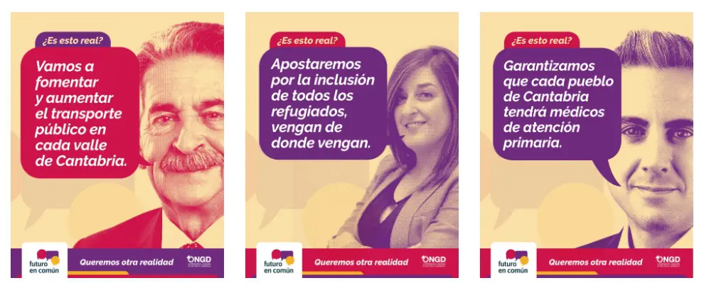 A través de imágenes de los candidatos de las formaciones políticas que han tenido representación parlamentaria en esta legislatura pasada, la Coordinadora de ONGD de Cantabria ha querido que los ciudadanos reflexionaran sobre la importancia de votar a aquellos partidos cuyas propuestas se alinearan mejor con las conclusiones sacadas del I Encuentro de la Sociedad Civil de Cantabria del pasado 01 de abril.