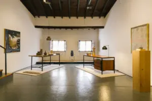 Los visitantes que acudan a ver la exposición encontrarán objetos en apariencia comunes (piezas de mobiliario como sillas, estanterías, mesas o lámparas) y obras de arte significativas de esa etapa. Pero los protagonistas son en verdad ese puñado de creadores (arquitectos y artistas principalmente) que a mediados del siglo pasado, en una España raquítica y sedienta, deci-dieron no acomodarse y buscaron una completa renovación de sus formas expresivas. Para ello, viajaron. El viaje es clave en toda esta historia porque implica exploración y conocimiento, por-que viajar es salir al encuentro de los otros para poder hallar así algo novedoso dentro de uno mismo. Esos viajes (físicos e intelectuales) que unos pocos emprendieron a mediados del siglo pasado dieron lugar a encuentros y de ellos nació un lenguaje propio, singular, no se limitaron a copiar lo que otros hacían. En esa época, en una España llena de artesanos y sin una estructura que permitiera la producción a nivel industrial, comenzaron a diseñarse los primeros muebles para ser fabricados en serie. El salto a la modernidad en España nació del diálogo con la tradición y de la integración de mundos que, hasta entonces, trabajaban por separado. Arquitectos, artistas y artesanos fueron de la mano en ese singular viaje moderno que hoy, tantos años después, sigue siendo el mismo camino porque el que continuamos avanzando ya bien entrado el siglo XXI. Teniendo en cuenta la estrecha relación que existe entre ética y estética, es incalculable la influencia que estos creadores, cuyos trabajos se expondrán durante un año en la Torre de Don Borja, tuvieron en la renovación y modernidad de todo un país.