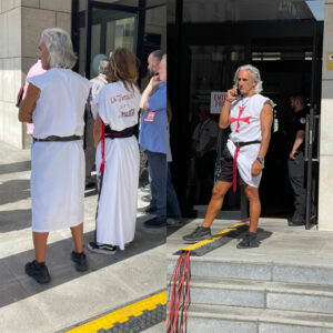 Como primera curiosidad, dos personas vestidas de algo similar a un templario, con un mensaje en la espalda de ella en el que se podía leer “la justicia está en huelga”. No tengo idea de qué pretendían, pero el caso es que no les dejaron pasar, para risas del líder del PSOE de Santander, Daniel Fernández, quien apuraba su cigarro al lado mío mientras ambos mirábamos con cara de circunstancias la situación.