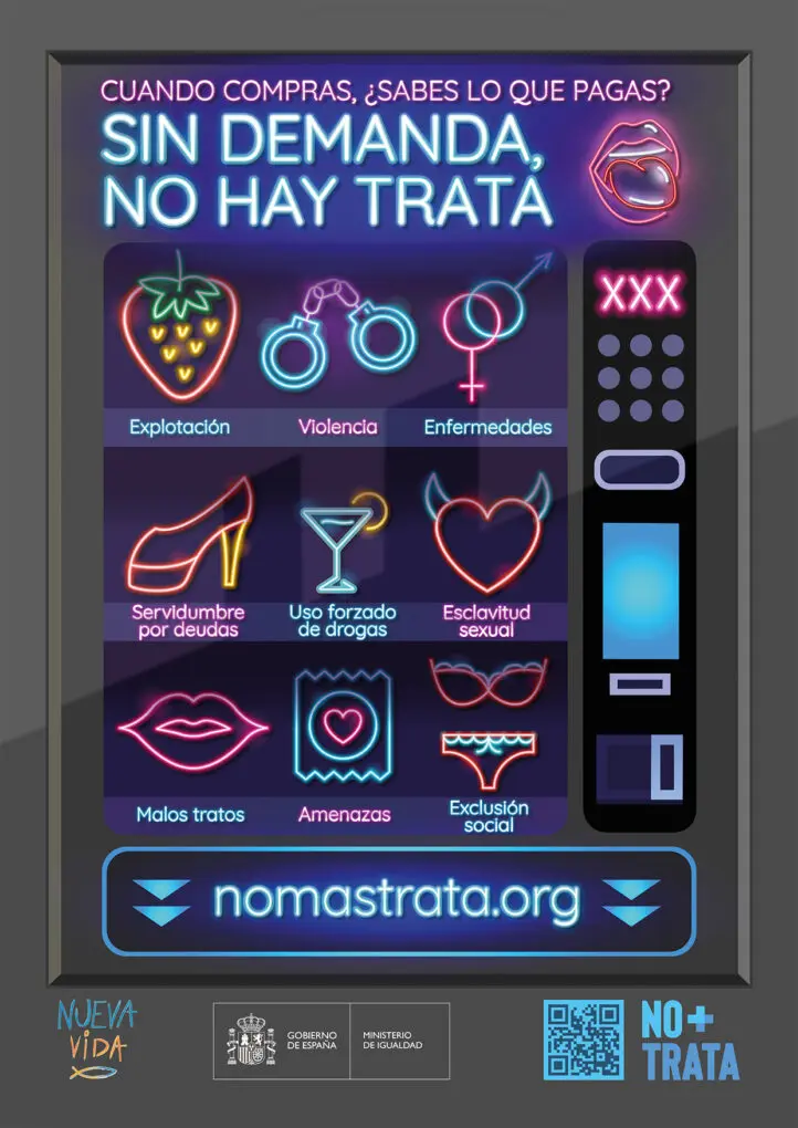 Por eso, el mensaje central de la campaña vuelve a dirigirse a los consumidores de prostitución e incidir en la pregunta: “Cuando compras, ¿sabes lo que pagas?”. Según recuerda Nueva Vida, «España es el primer país de Europa en consumo de prostitución y el tercero a nivel mundial, según datos de la ONU, de ahí que otro de los objetivos de esta iniciativa de sensibilización sea subrayar que sin demanda, no hay trata”.