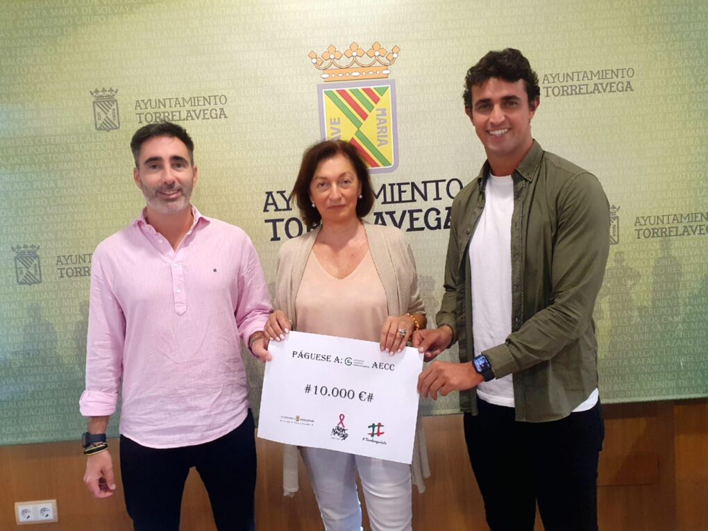 El concejal de Juventud y Deportes, Nacho González; y Loren Berrazueta, de la Asociación Rosa Navidad, han hecho entrega a Ana Barca, presidenta de la Junta Local de Asociación Contra el Cáncer en Torrelavega, del cheque por valor de 10.000 euros correspondiente a la recaudación del evento solidario ‘Rosa Jubilar’, que se celebró el pasado mes de mayo en Torrelavega.