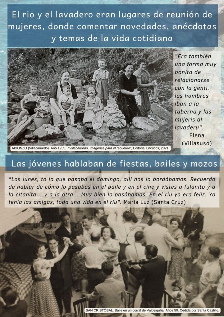Para las niñas y mozas, los lavaderos y los ríos eran espacios de aprendizaje, de desvelamiento de tabúes; un espacio de socialización en el que, en una época en que se preparaban para ser esposas y madres, aprendían lo que estaba bien visto o no en la conducta de una mujer. Sintomáticamente, la fuente de las normas estaba en las fuentes del agua.