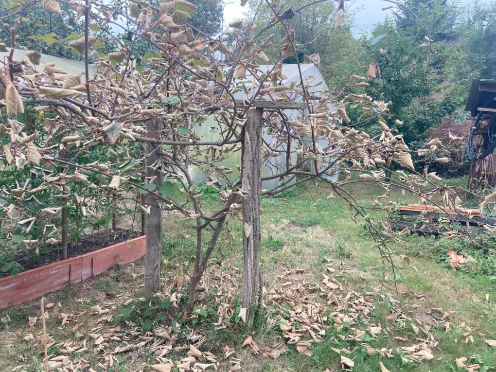 Seguí caminando y me sorprendieron las hojas secas de los cinco kiwis, muchas ya en el suelo y el resto todavía en las ramas. Días más tarde cayeron todas la asuelo.