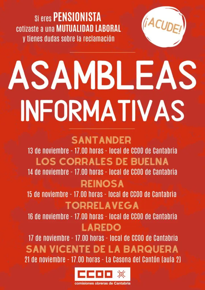 El sindicato ha anunciado que va a iniciar el 13 de noviembre una ronda de asambleas informativas por distintos municipios de la geografía regional. Serán en los locales que CCOO tiene en cada localidad, a las 17.00 horas. Comenzará en Santander el lunes, 13 de noviembre, en el salón de actos de CCOO de Cantabria (calle Santa Clara, 3); seguirá el 14 en Los Corrales de Buelna; el 15 en Reinosa; el 16 en Torrelavega y el 17 en Laredo. Además, habrá una asamblea en La Casona del Cantón, en San Vicente de la Barquera el martes, 21 de noviembre, a las 17.00 horas. En ellas, las personas afectadas podrán informarse de los pasos a seguir para hacer efectiva la reclamación, una tramitación en la que podrán contar en todo momento con la asesoría del sindicato.