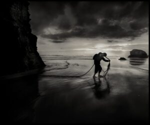 Escribe Javier Vila sobre la imagen protagonista de este último mes de 2023: «Un hombre cansado, exhausto, tira de una gruesa maroma, que es a la vez el débil cordón umbilical que le sujeta al mundo. Nota el frio de la historia en sus pies descalzos que se entregan a la melancolía de la bajamar, en ese vínculo intangible entre su existencia y la vastedad del universo.