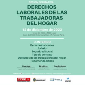 Comisiones Obreras de Cantabria (CCOO) ha organizado para los días 12, 13 y 20 de diciembre tres sesiones sobre derechos laborales de las trabajadoras del hogar, violencia de género y acoso sexual y prestaciones sociales destinadas a mujeres migrantes residentes en Santander.